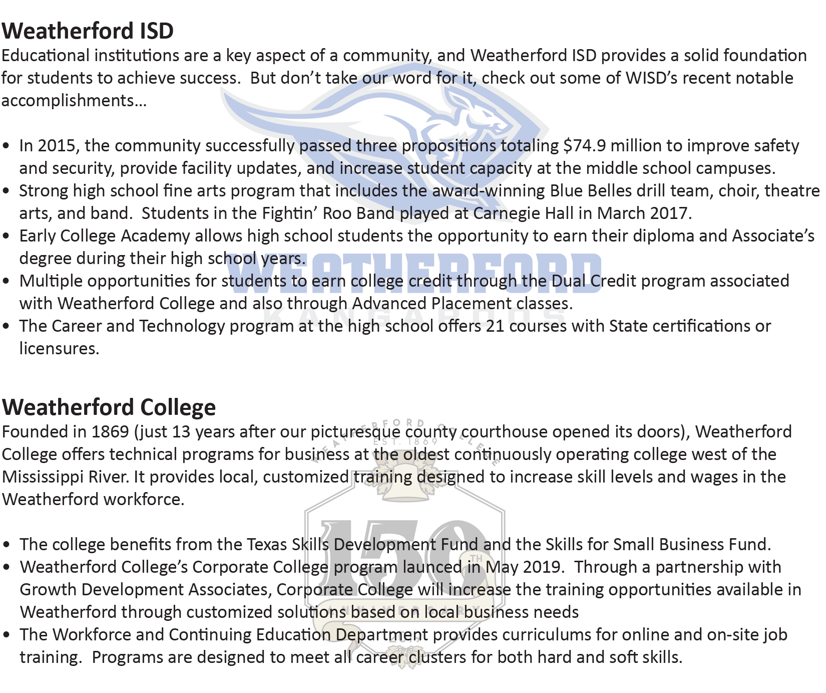 Starting with an exceptional, award-winning K-12 school system, quality education is vitally important in Weatherford. That continues through historic Weatherford College, which works with business to provide vocational degrees and training.